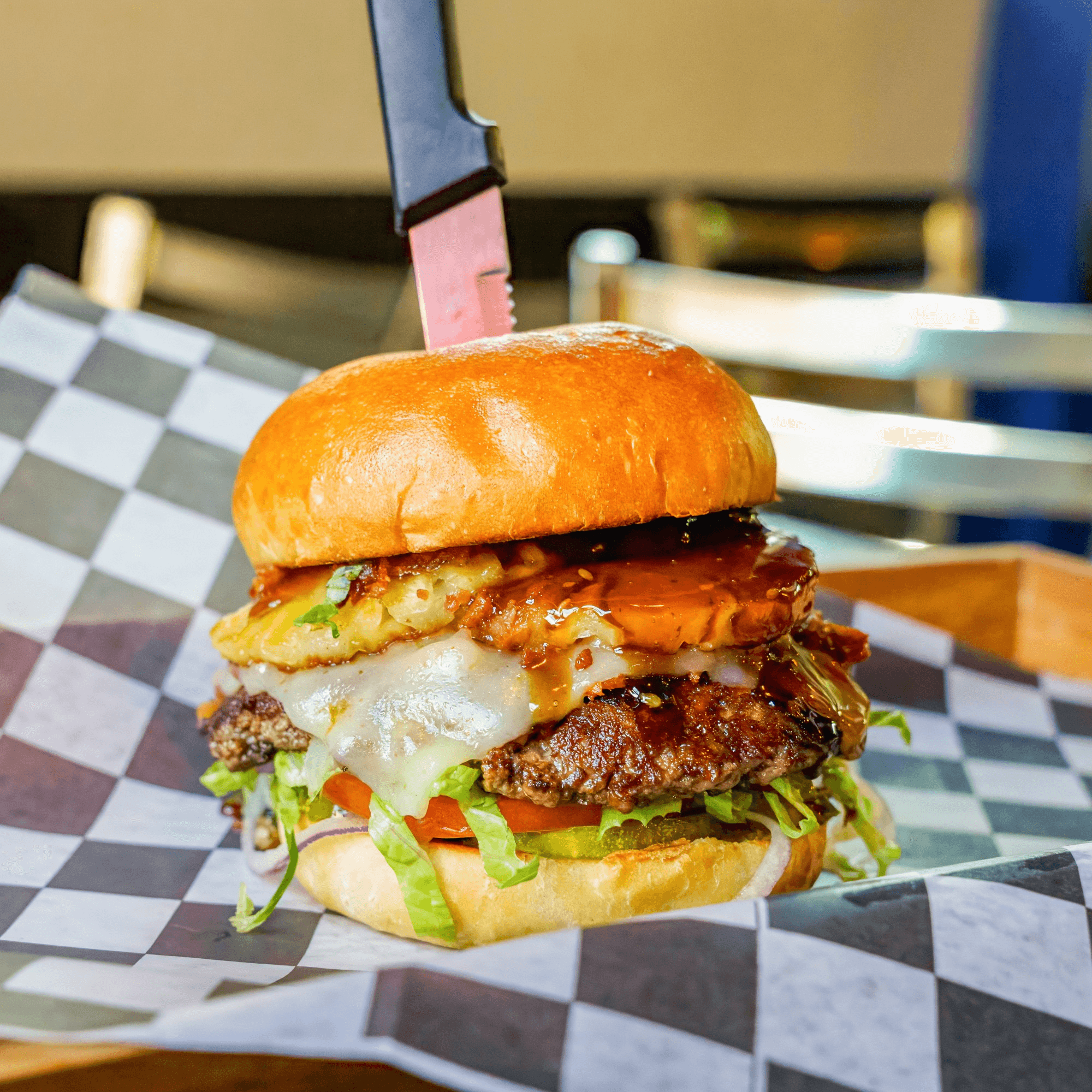 Four 3oz smash patties stacked with chili crisp, grilled onions, chopped bacon, and yes — marshmallow fluff.
